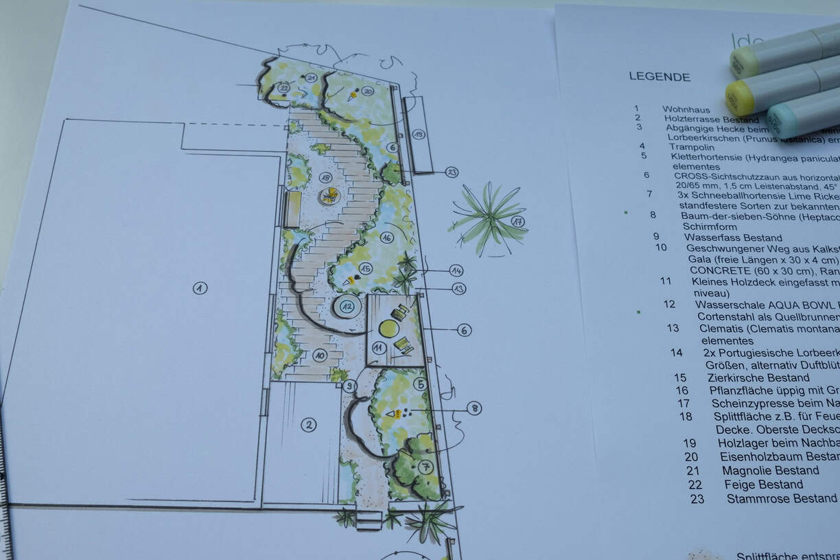 Ideenreich – kreative Gartenplanung hat sich auf die individuelle Gestaltung von Privatgärten im Raum Stuttgart, Esslingen, Kirchheim, Göppingen und Nürtingen spezialisiert. Wir übernehmen Planungen für Ihren gesamten Garten oder auch nur für Teilbereiche, egal ob es sich hierbei um eine Neuanlage oder Umgestaltung handelt. Je nach Bedarf können wir ganz individuell auf Ihre Wünsche zur Gartengestaltung eingehen. Von einfachen Entwurfsskizzen über konkrete Entwurfsplanungen bis hin zur detaillierten Bepflanzungsplanung ist alles möglich. Alle unsere Entwürfe sind handgezeichnet und individuell auf Sie abgestimmt.